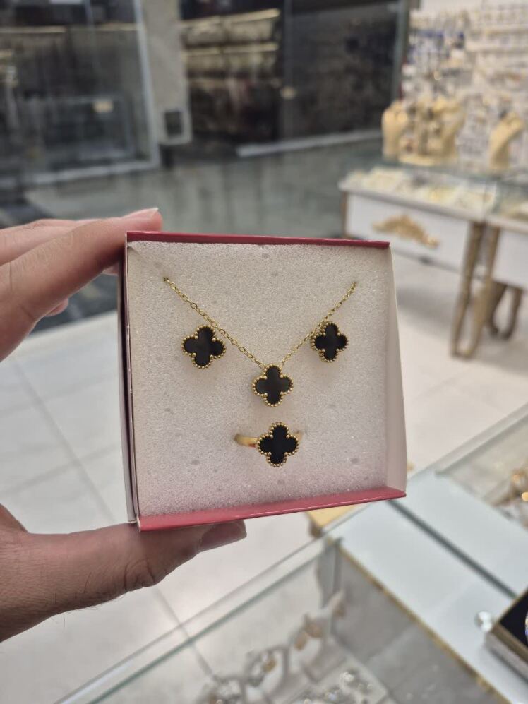 نیمست استیل ونکلیف مشکی | گردنبند + گوشواره + انگشتر طرح شبدر فری سایز | رنگ ثابت و ضدحساسیت