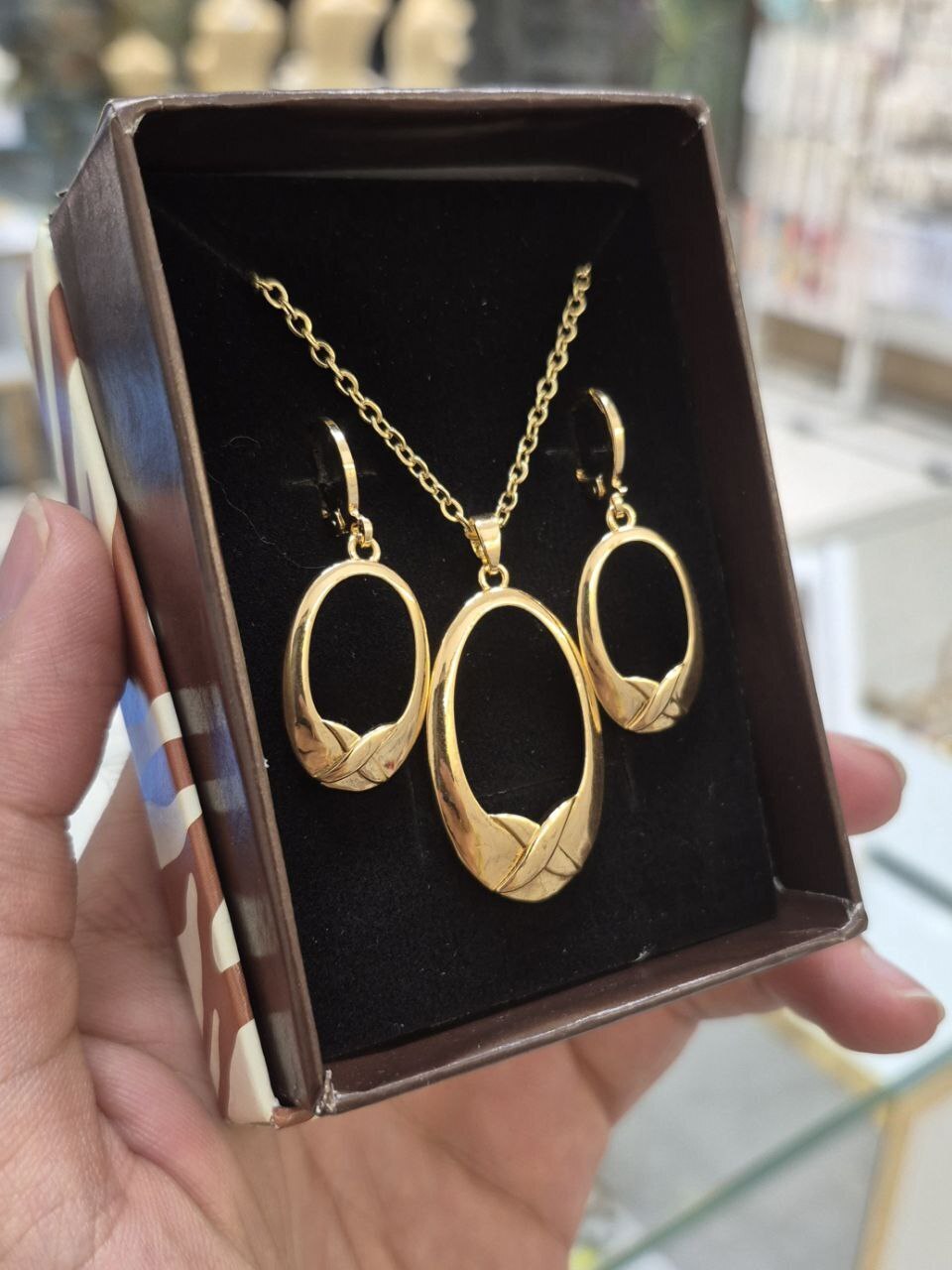 نیم ست دخترونه با گوشواره های آویز و زنجیر طرح طلا با هارد باکس مناسب هدیه و کادو