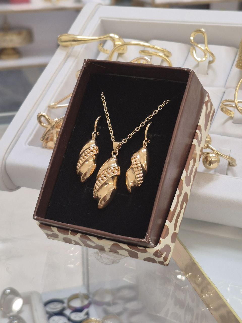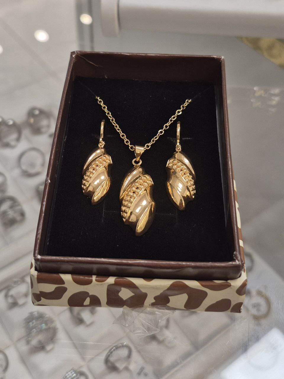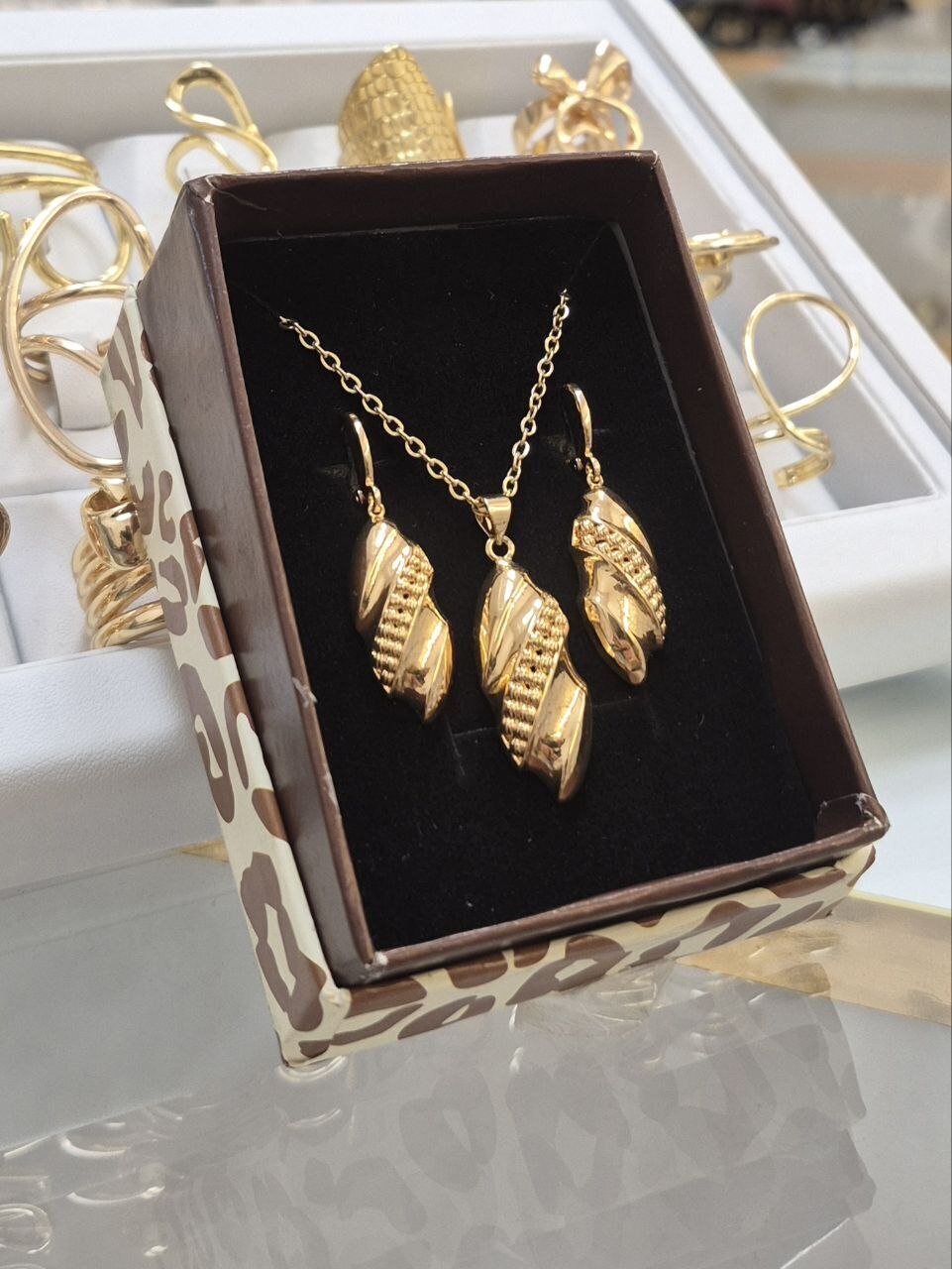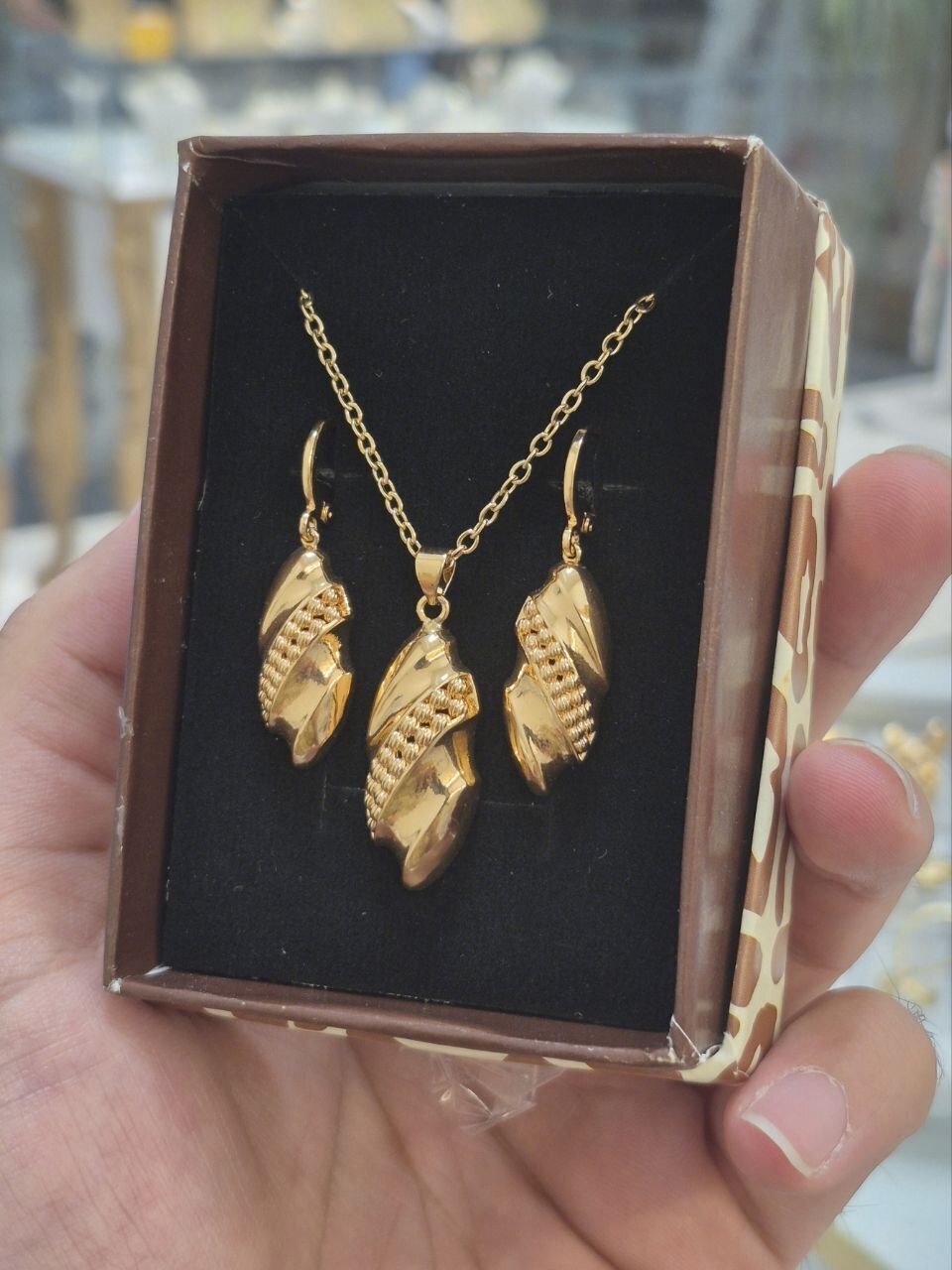 نیم ست دخترونه با گوشواره های آویز و زنجیر طرح طلا با هارد باکس مناسب هدیه و کادو