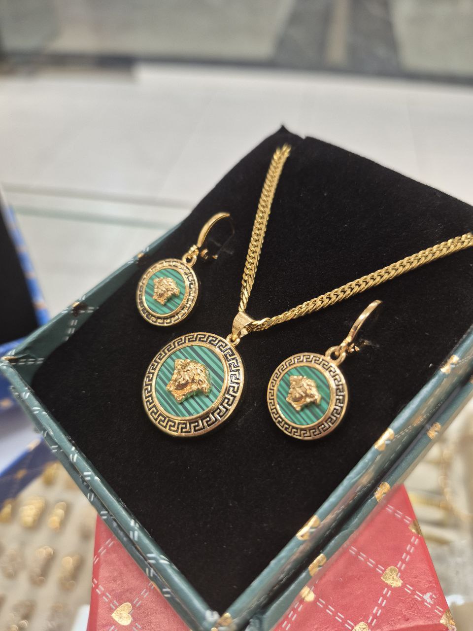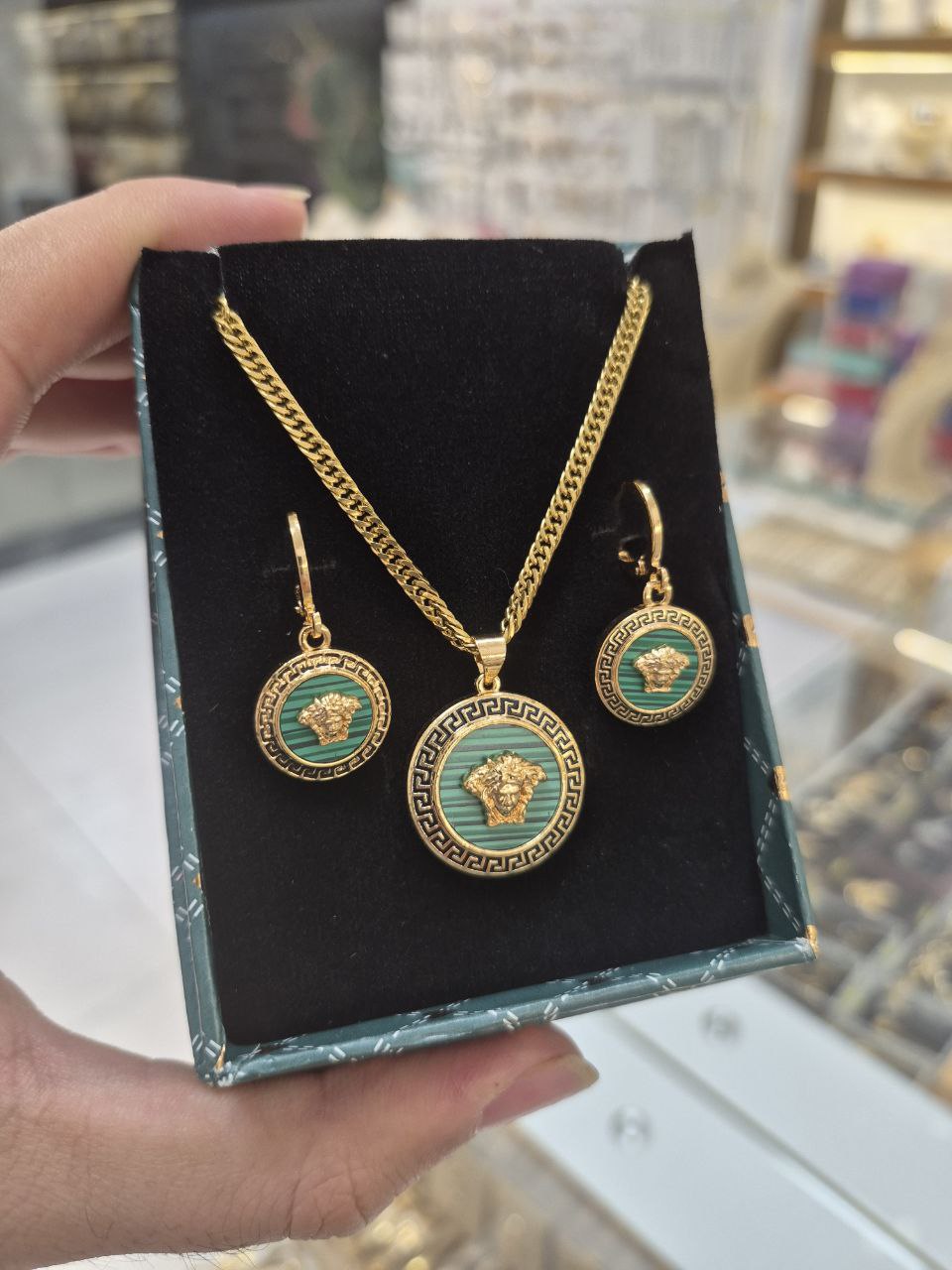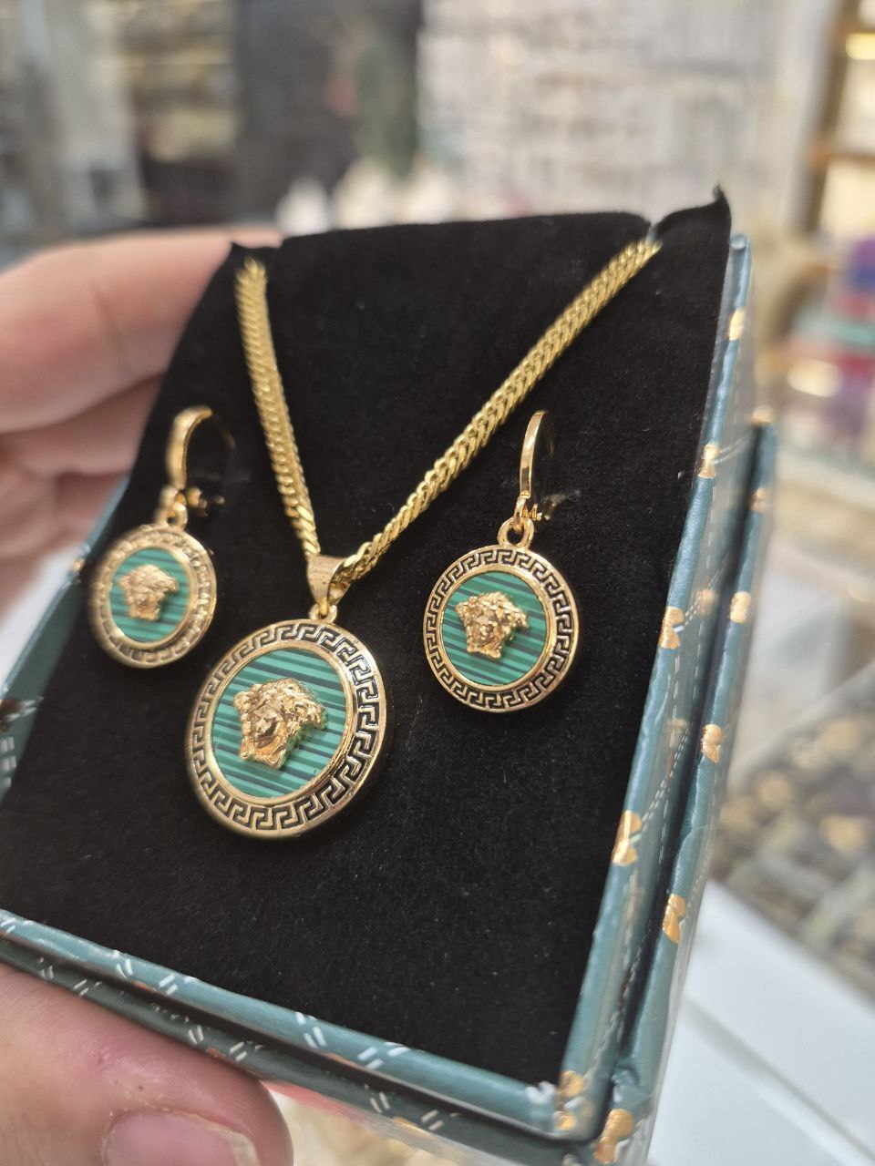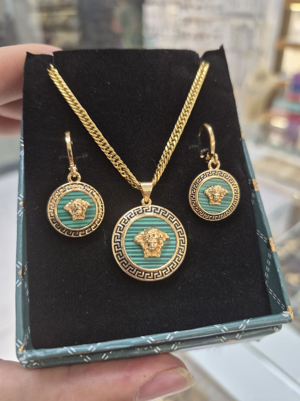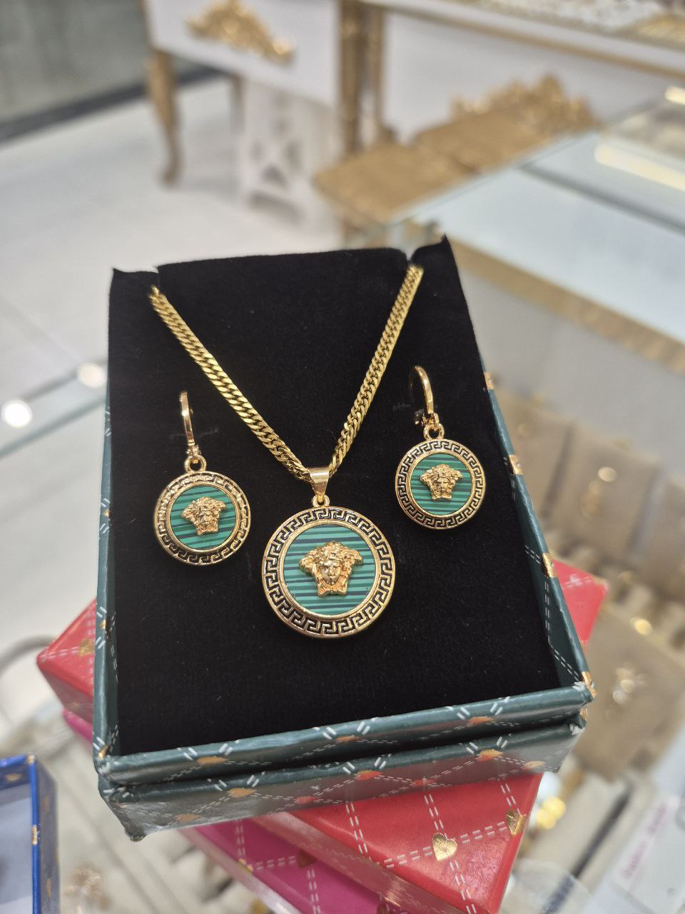 نیم ست دخترونه ورساچ با گوشواره های آویز و زنجیر طرح طلای کارتیر با باکس جذاب طلاکوب