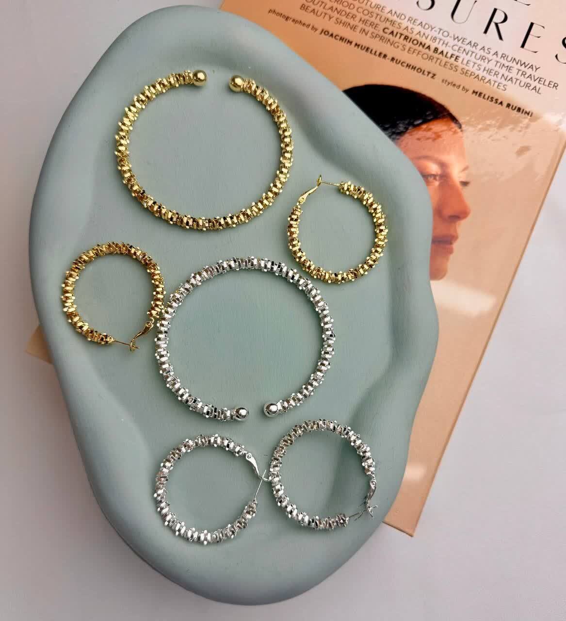 ست دستبند و گوشواره خاویاری لوکس | حلقهای بافت | رنگ طلایی و نقرهای